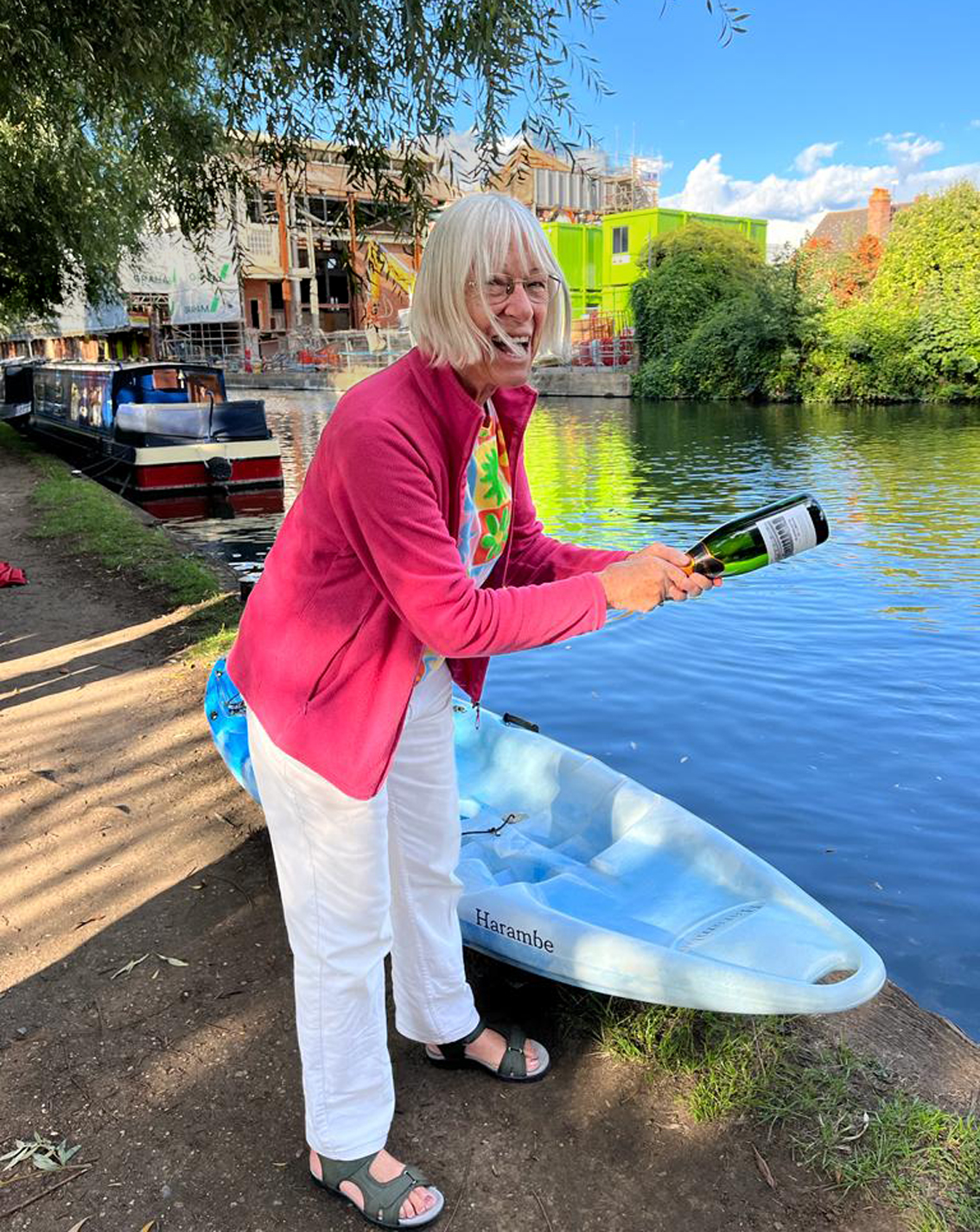 The kayak, named Harambe (Swahili for ‘All pull together’), in honour of Simon’s connections with Kenya, was launched on Friday 16 September. There was a good turnout of islanders beside the Thames in East Street, including Simon’s daughter Jen and grandson Isaac. Cllr Susanna Pressel waved a ceremonial bottle of prosecco at the kayak’s bow and Alan Goodwin raised a toast in honour of Simon. Isaac took the kayak on its maiden voyage, with safety supervision by Fiona Ravenscroft from the Boat Club.
