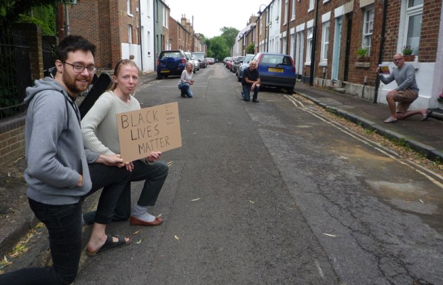 Osney residents take part in the Stand up to Racism doorstep protest this evening against the killing of George Floyd