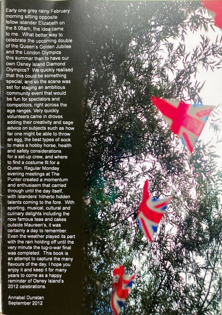 In 2012, the year of the London Olympics and the Golden Jubilee, Annabel Dunstan came up with the idea of an Osney Olympics. This booklet shows the resulting event, organised by a team of islanders. There are plenty of familiar faces.